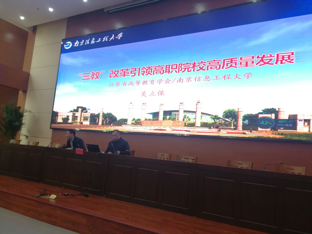 为贯彻落实教育部《职业教育提质培优行动计划(2020—2023年)》文件精神,2020年12月18日下午,江苏省高等教育学会秘书长,南京信息工程大学高教所所长吴立保教授应邀在我校学术报告厅作了题为“职教新时代高质量课堂教学新思维——基于‘三教’改革的教学大赛反思”的学术报告。报告由人事处副处长王小俊主持,各二级学院领导和教师聆听了讲座。