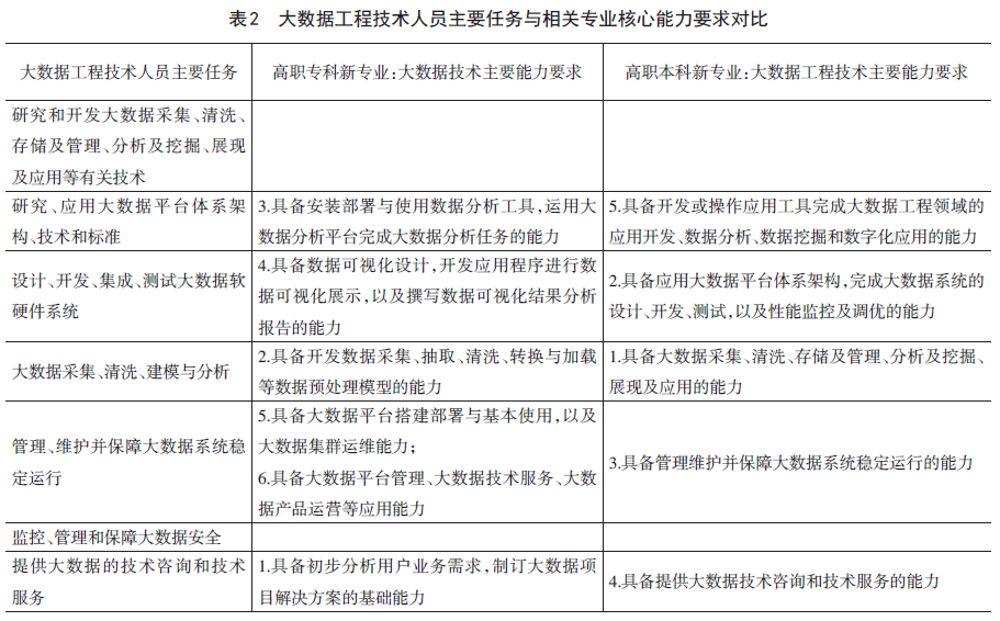 一是新专业核心能力要求与新职业主要任务匹配尚存在空白。为学生奠定适应或胜任岗位的技术技能与文化知识基础,是职业院校人才培养的基本目标。对比分析发现,高职专科与高职本科专业人才培养核心能力要求未能完全覆盖新职业主要任务的各个方面,在某一或多个任务领域存在空白。例如,人工智能工程技术人员具体任务中重要的一项“规划、设计、开发基于人工智能算法的芯片”,高职专科专业与高职本科专业,均无核心能力要求与之对应。作为一种技术含量较高的工作内容,理应在高层次技术技能人才培养即本科层面有所涉及。这种现象在大数据工程技术人员以及与之相对应新专业中也存在。如,大数据工程技术人员具体任务之一“研究和开发大数据采集、清洗、存储及管理、分析及挖掘、展现及应用等有关技术”,作为大数据相关岗位的基本能力,专科层次和本科层次专业核心能力素养均未涉及。主要任务“监控、管理和保障大数据安全”同样如此,对职业岗位数据安全方面的任务支撑不足。作为数字经济的基石,数据安全理应成为大数据人才核心能力培养必不可少的内容。