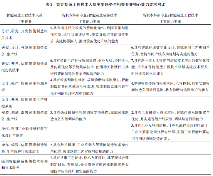 第三,先进制造业与新一代信息技术深度融合,智能制造成为我国推动产业技术变革和优化升级的主攻方向。习近平总书记指出:“要以智能制造为主攻方向推动产业技术变革和优化升级,推动制造业产业模式和企业形态根本性转变,以‘鼎新’带动‘革故’,以增量带动存量,促进我国产业迈向全球价值链中高端。”智能制造已经成为推动我国制造业高质量发展的强劲动力,但同时也存在一些突出问题,其中,智能制造人才结构式缺口是最大制约因素之一。据人社部统计,2020年我国智能制造领域的人才需求为750万人,缺口达300万人;到2025年,人才缺口预计达到450万人。鉴于此,本研究将智能制造作为第三个切入点,选择了“智能制造工程技术人员”新职业,再基于此确定了职业面向涵盖“智能制造工程技术人员”的新专业,即高职专科智能制造装备技术专业、高职本科智能制造工程技术专业。(表3)